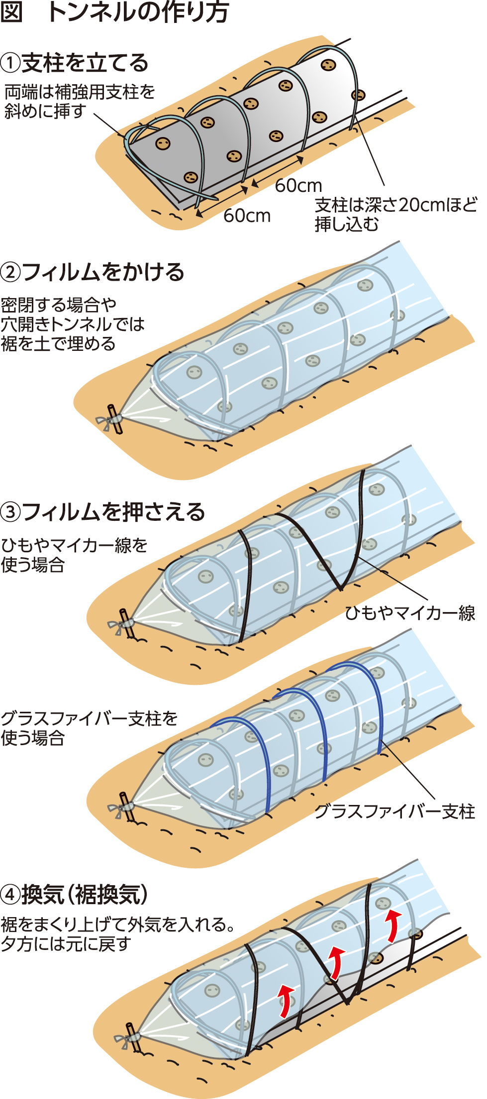 春に向かって光が強くなったら、トンネル内は30度を超えるため、温度が上がり過ぎないように換気をします。フィルムの裾を開閉する「裾換気」と、フィルムに直径10cm程度の穴を開ける「穴開け換気」があります。資材の再利用や換気の手間を考え、種まき時期にかかわらず穴開き率(フィルム表面積に対する穴開き面積の割合)1、2%程度の資材を選択すると換気の手間を省けます。