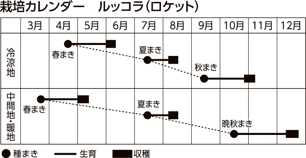 各社から「ルッコラ」または「ロケット」として販売されています。なお、ルッコラの野生種といわれるセルバチコには、葉が細くとがり香りが特に強い品種「ローマ」(トキタ種苗)もあります。