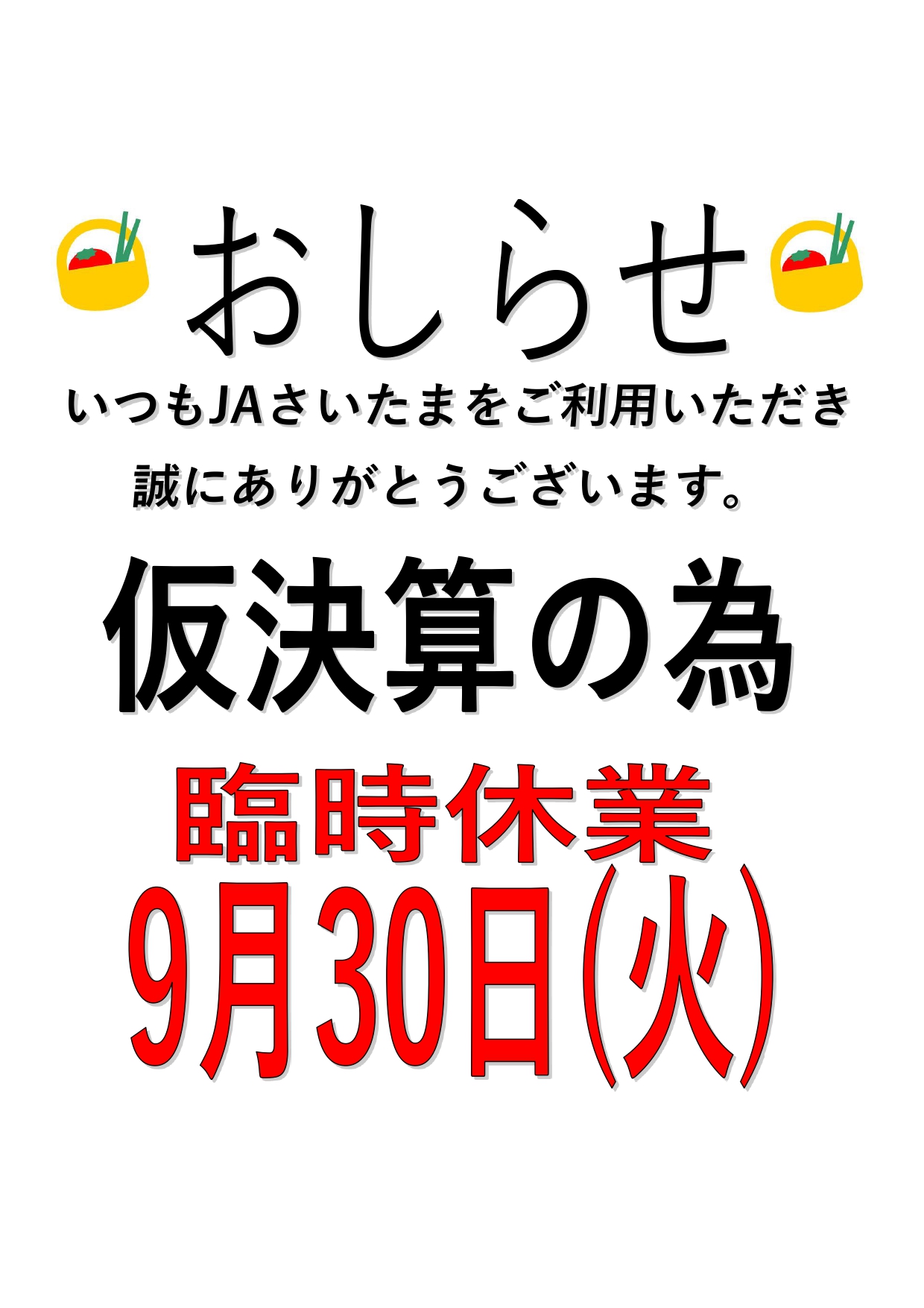 誠に勝手ながら9月30日(火)は、仮決算業務のため全店で臨時休業いたします。