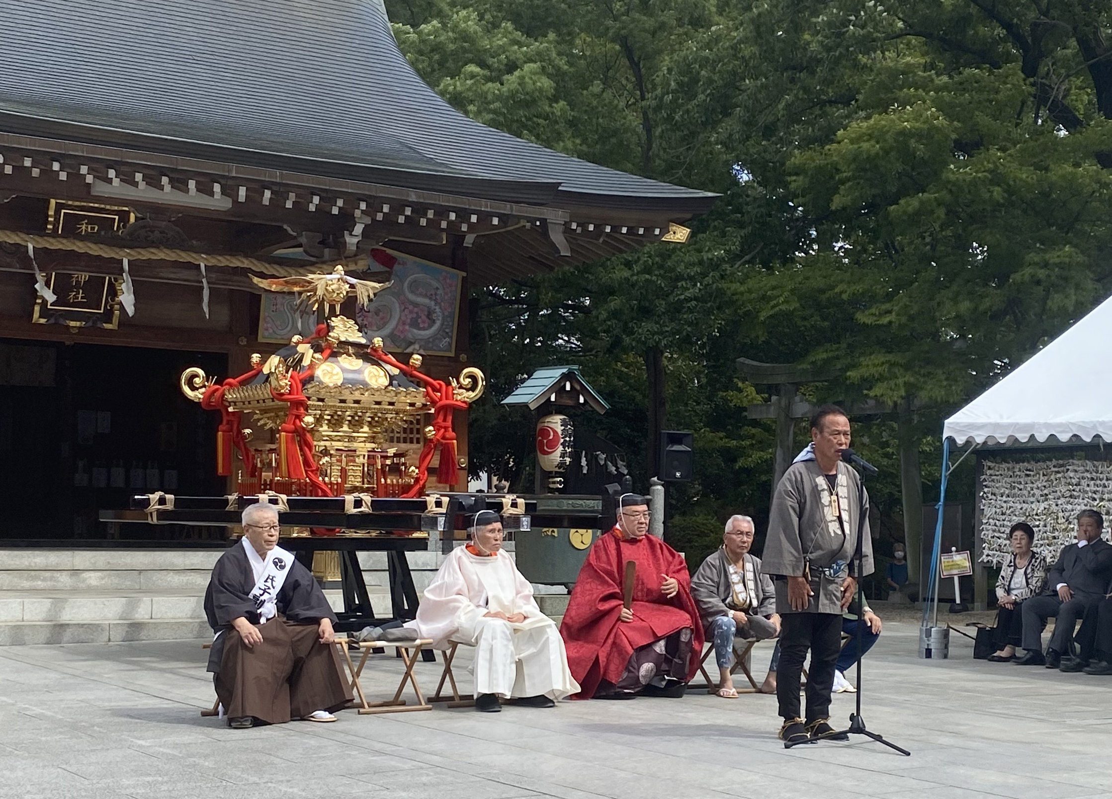 神輿は旧中山道、駅前通りを通り和樂備神社へ宮入。式典では神社の副総代長であり、支店運営協力副委員長である栗原良夫さんが挨拶しました。