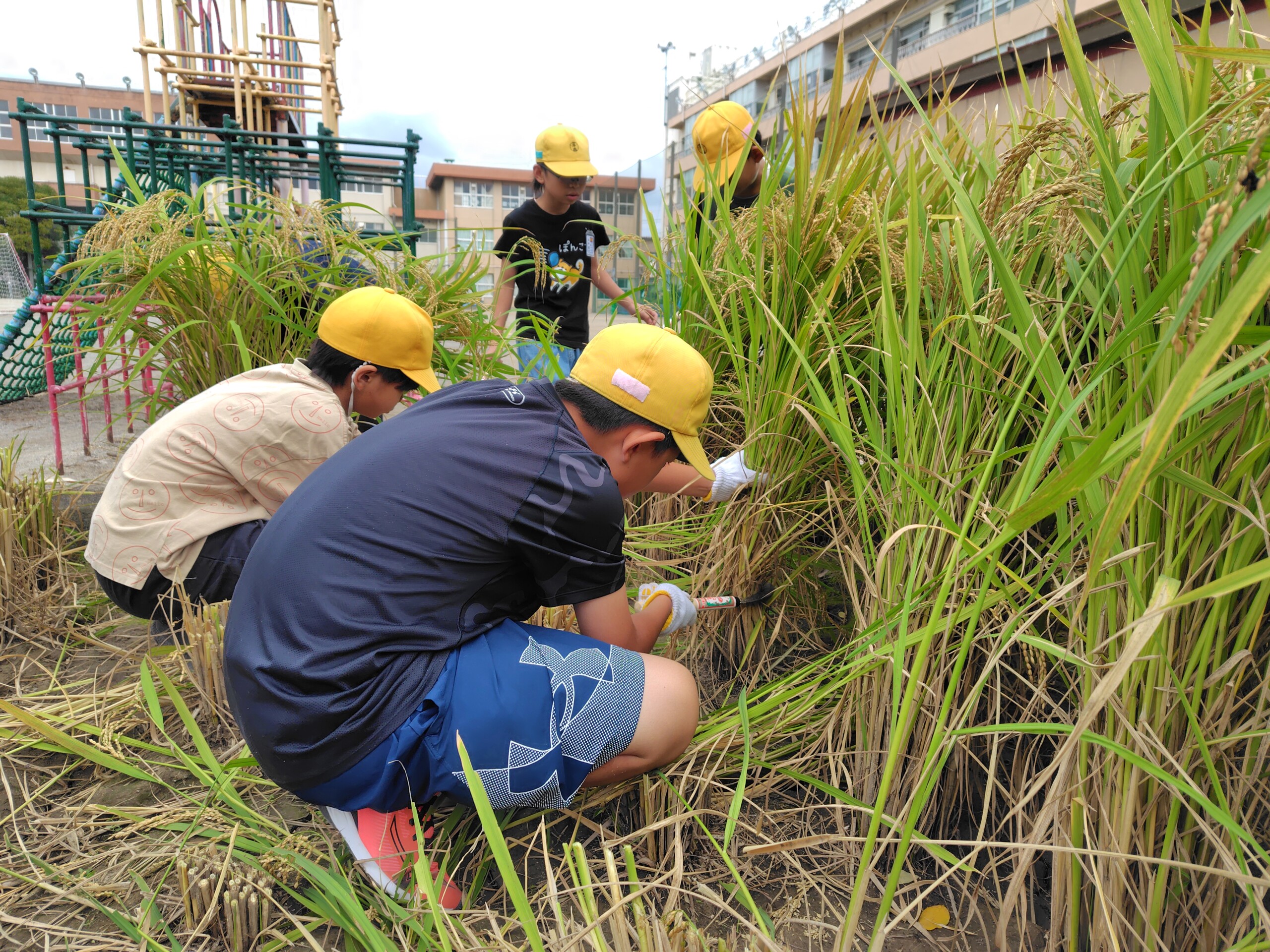 10月9日、新郷南小学校で稲刈り体験教室を開きました。参加した5年生77人は、手狩りした稲をプールサイドのフェンスに掛ける作業まで行いました。