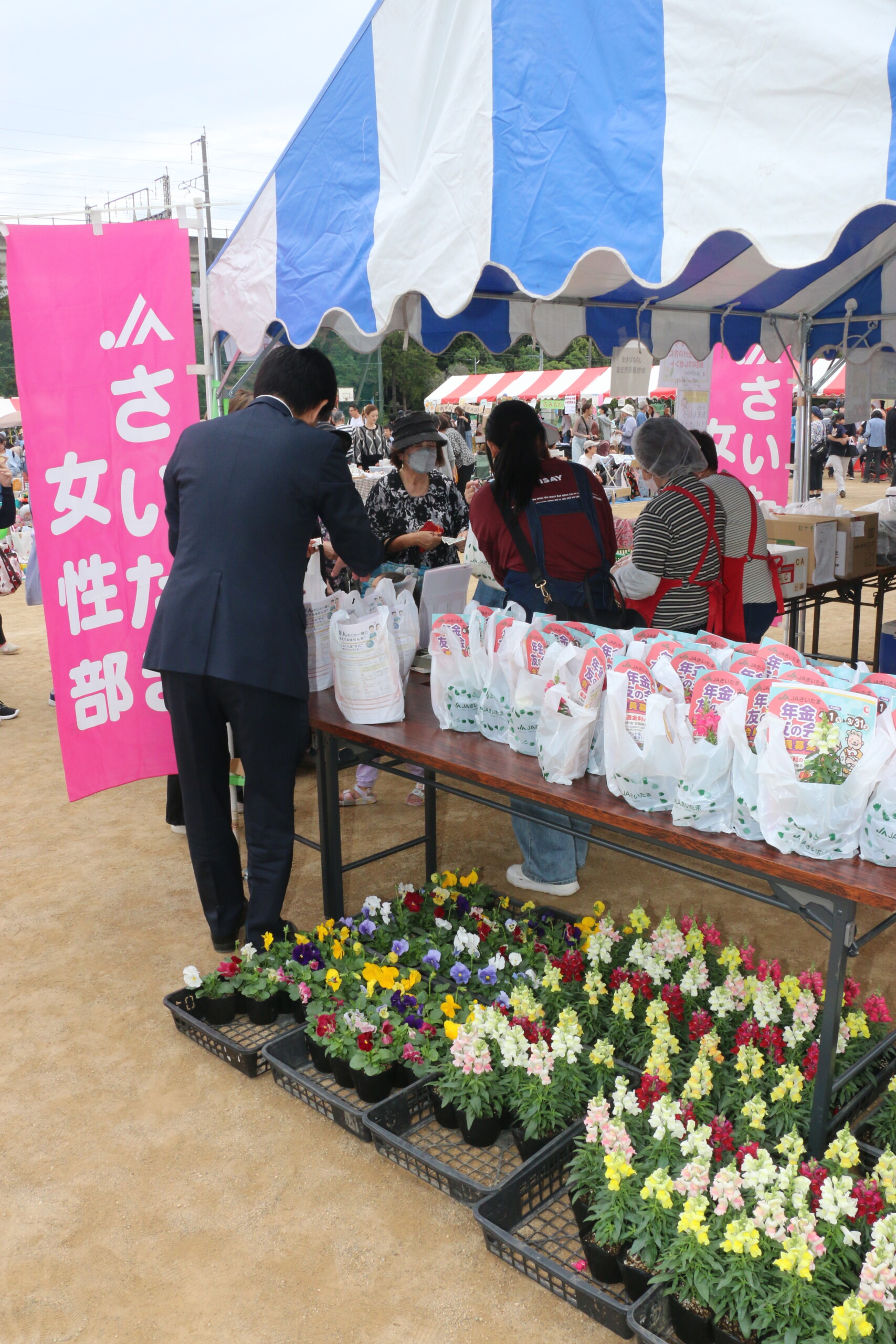 10月19日、当支店管内の上尾市立原市小学校の校庭で開催された「元気フェスタ原市2025」に出店。女性部原市支部による手作りのおまんじゅう1,000個を販売し、支店協同活動として先着300人の購入者にポット花をプレゼントしました。