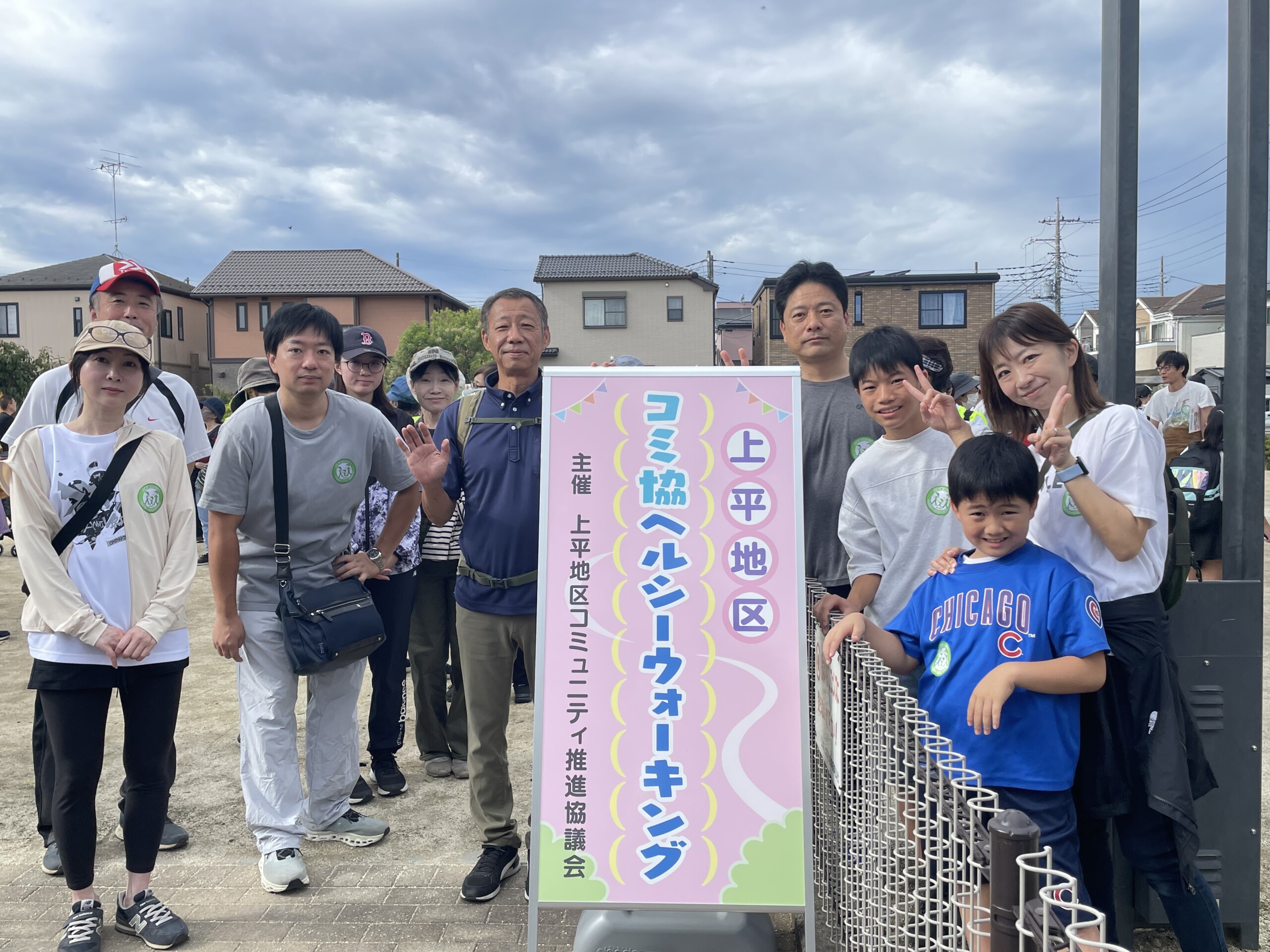 10月19日に開催された「上平地区コミ協ヘルシーウォーキング」に、当支店職員と家族11人が参加。地元を巡る約5.4㌔のコースを、総勢181人の参加者と共に歩きました。