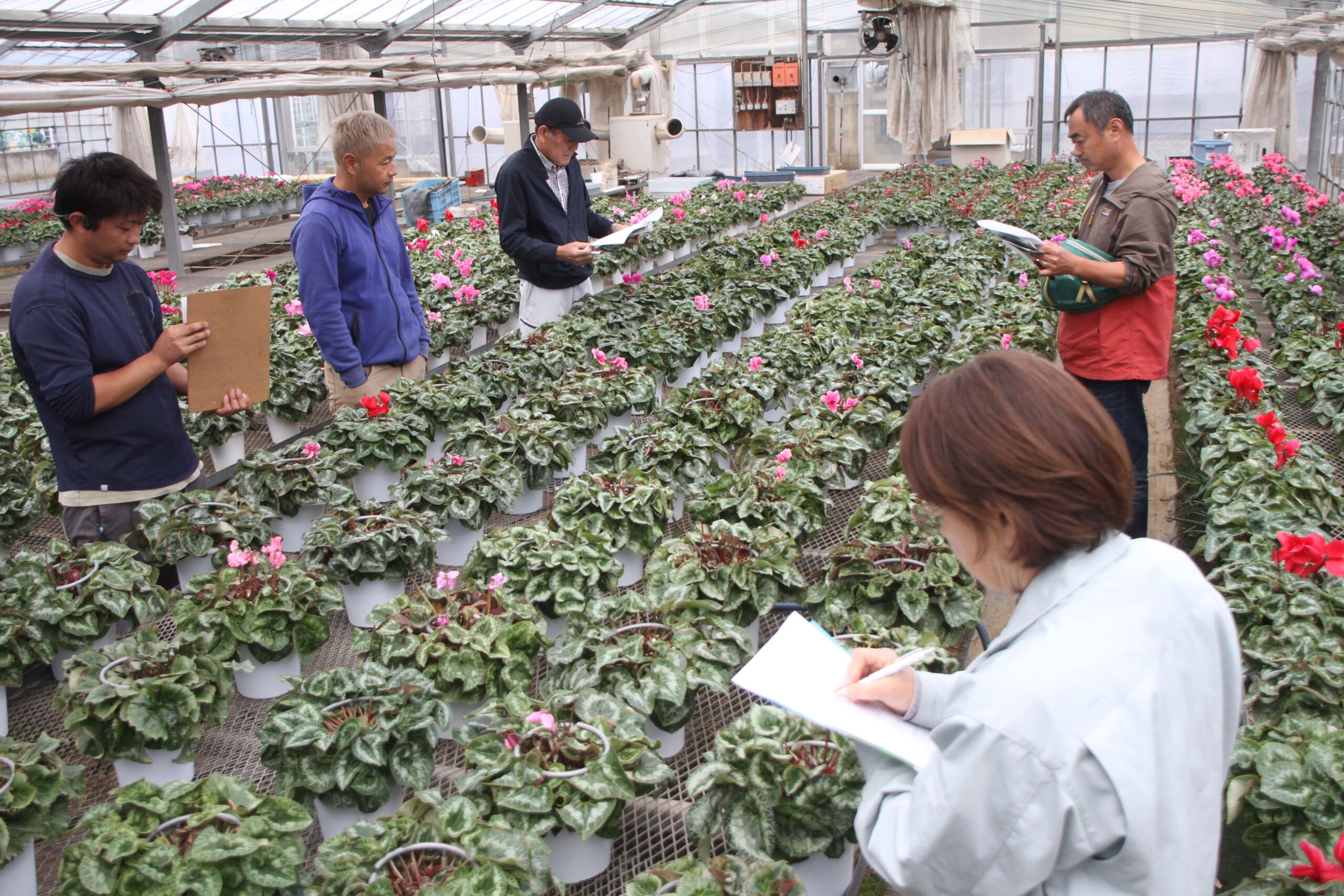 さいたま市花卉園芸組合シクラメン研究会は10月24日、生産者の圃場7カ所を巡回して生育状況を確認する現地検討会を開催。各生産者が自園の肥培管理や防除などを報告し、今後の管理について意見を交わしました。