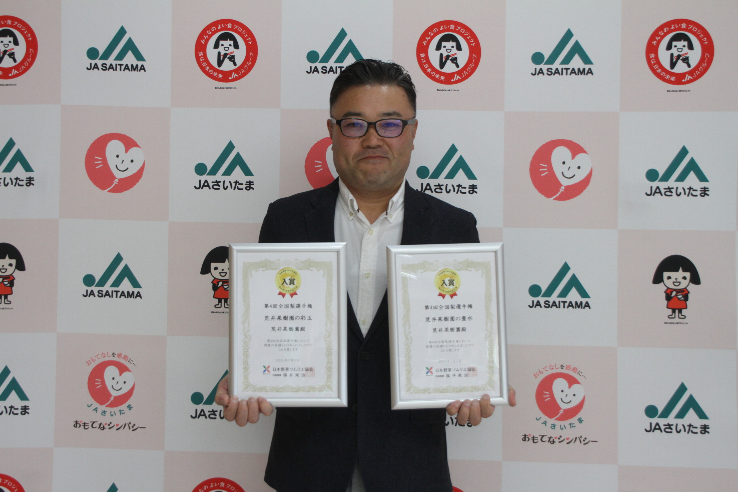 産地や品種、生産者の情報を伏せてソムリエ資格を有する20人が行う食味審査の結果、当支店管内の荒井果樹園の荒井広志さんが栽培した梨「彩玉」と「豊水」が入賞。同園の梨は2年連続入賞となりました。