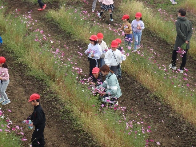 当支店管内の島田正次さんの畑で、7月に種まきしたコスモスが見頃を迎え、11月5日にさいたま市立植水小学校1年生が恒例の摘み取り体験を行いました。