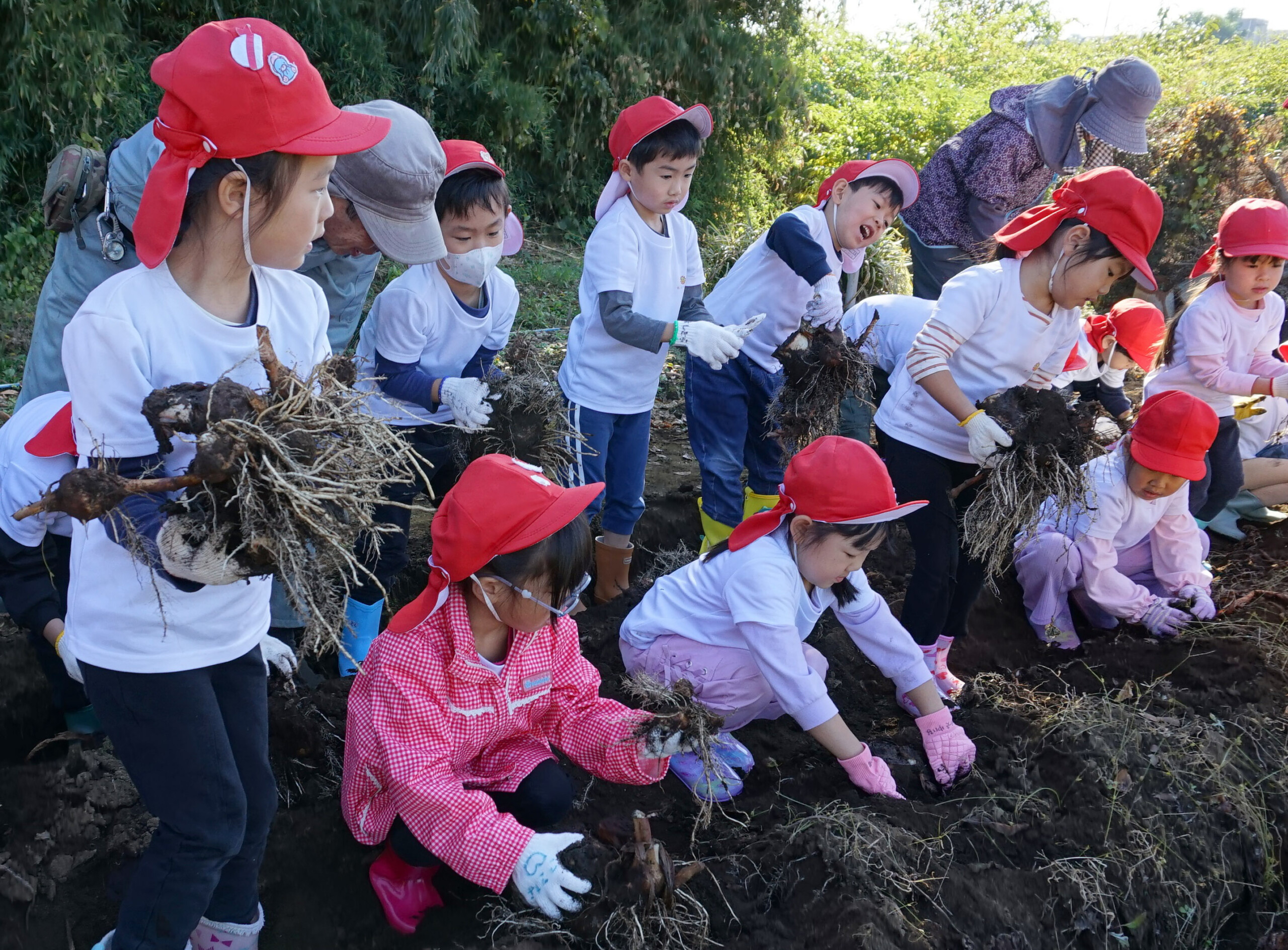 川口市の髙津園芸で11月21日、市内のたいよう保育園中青木園の園児42人が八つ頭の収穫体験を行いました。