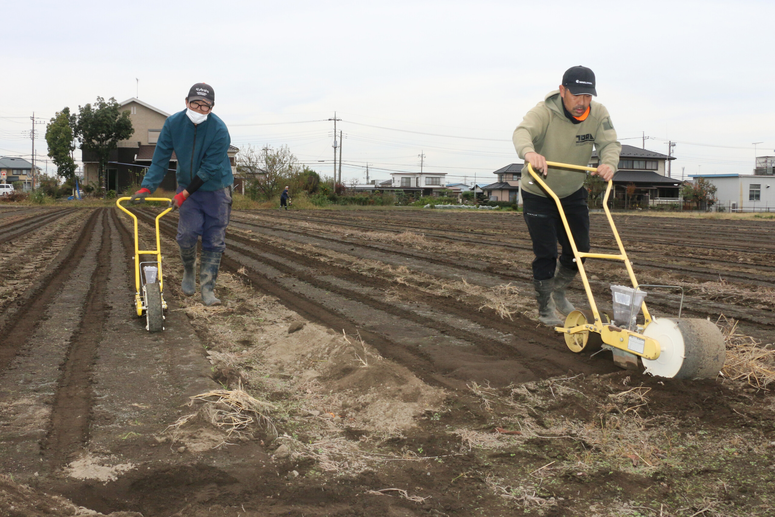 北本市にある直売所「地場物産館桜国屋」に隣接する約40㌃の畑で11月5日、「北本イケメン野菜」を生産する北本市農業青年会議所の11人がネモフィラの種まきをしました。