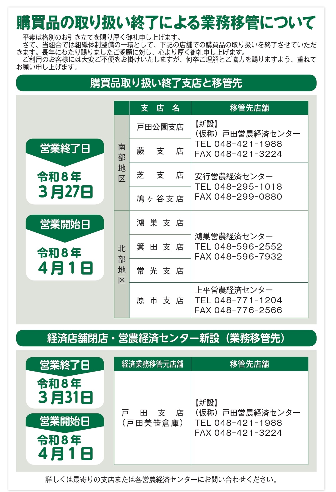 購買品の取り扱い終了による業務移管について