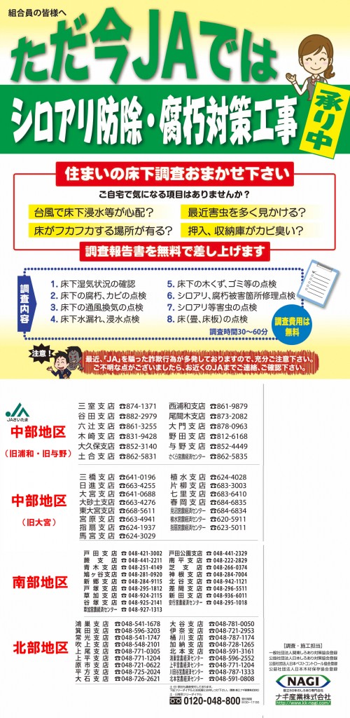 ただ今、JAさいたまでは、シロアリ防除・腐朽対策としてお住まいの床下無料調査を実施しております。