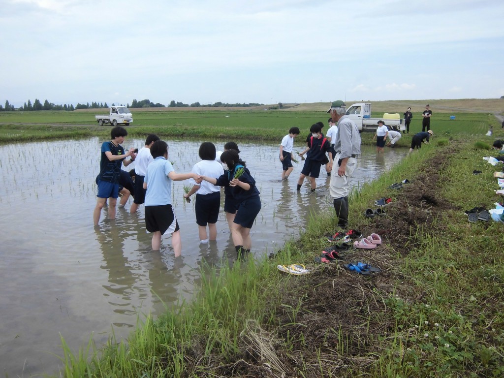 長島祥一さんら8人の農家協力のもと、5年生の児童102人が通学路沿いの田んぼで田植えを行いました。収穫したお米は家庭科の授業で食育の勉強を兼ねて食事をする予定です。